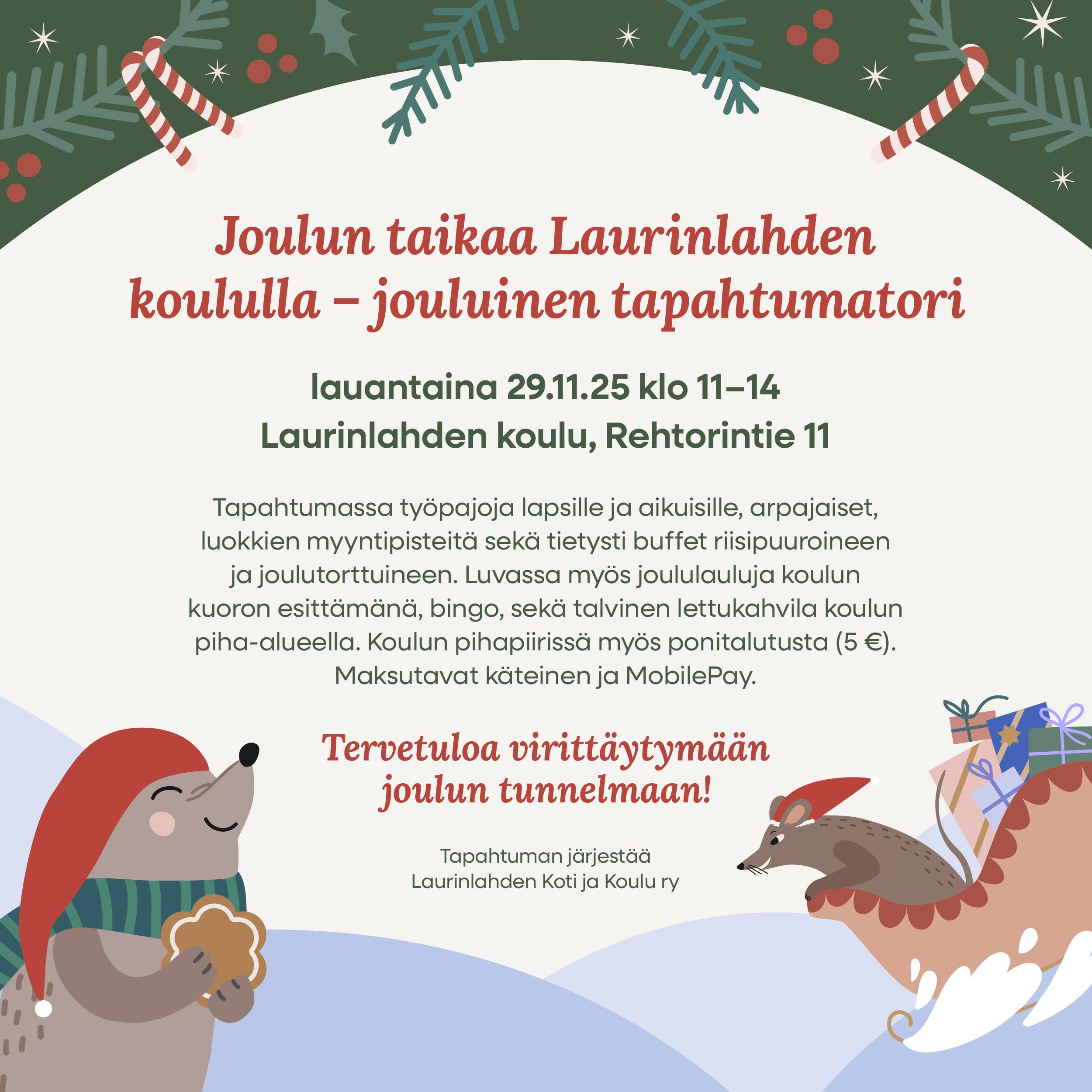 Koulun ala-aulaan rakentuvalla jouluisella tapahtumatorilla on ohjelmaa koko perheelle. Luvassa on edellisvuosien tapaan mm. poniratsastusta tapahtuman ajan, arpajaiset, kranssi- ja askartelupaja, leikkimielistä kisailua sekä buffet, jossa tarjolla riisipuuroa, joulutorttuja ja muita herkkuja. Lisäksi pihalle avautuu talvinen lettukahvila, joka järjestetään yhteistyössä Laurinlahden yhdyskunnan kanssa.