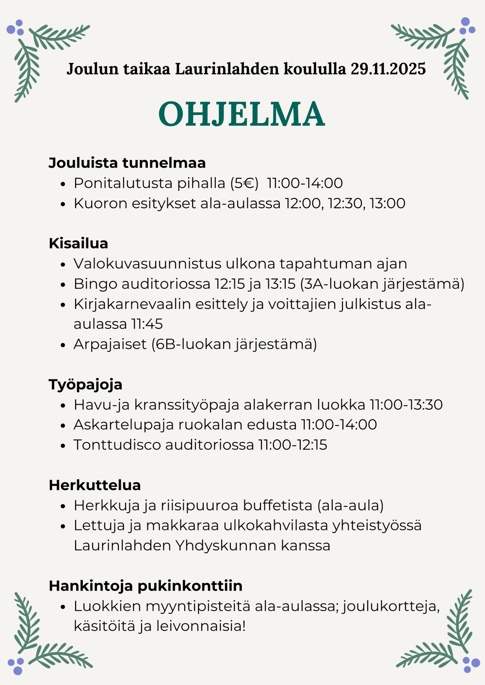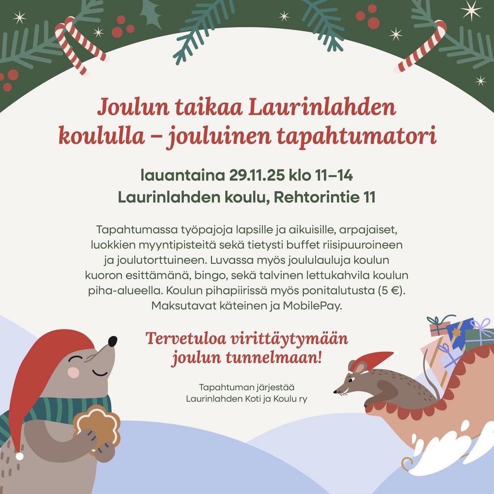 🎄Laurinlahden koulun luokkia on mukana tapahtumassa myyntipisteillä, joilla kerätään varoja luokkien leirikouluihin. Luvassa on ainakin käsitöitä, joulukortteja sekä leivonnaisia pukinkonttiin sekä bingo auditoriossa!
