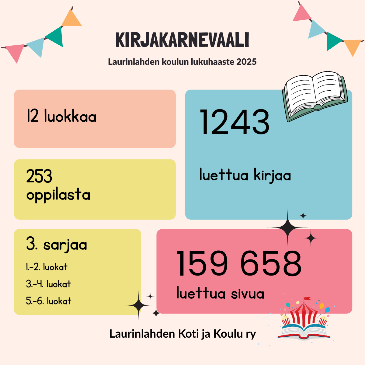 Laurinlahden koulussa syksyllä 2025 järjestetty Kirjakarnevaali-lukuhaaste kannusti oppilaita tarttumaan kirjoihin ja nauttimaan lukemisen ilosta. Haasteen tavoitteena oli vahvistaa lukutaitoa ja innostaa lukemaan monipuolisesti erilaisia kirjoja ja kirjallisuutta. Leikkimielisessä haasteessa kisailtiin sitä, mikä luokka luki sivumäärällisesti eniten omassa sarjassaan. Haasteen aikana koulun oppilaat lukivat huimat 1243 kirjaa ja yhteensä 159 659 sivua!!!